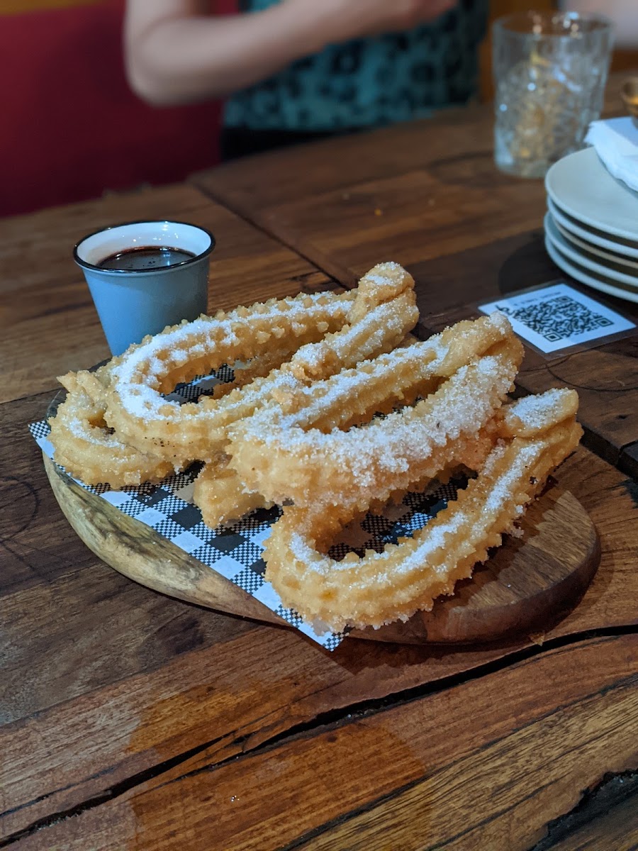 Spanish Churros: Crispy, cinnamon-dusted churros served with a thick chocolate dip.