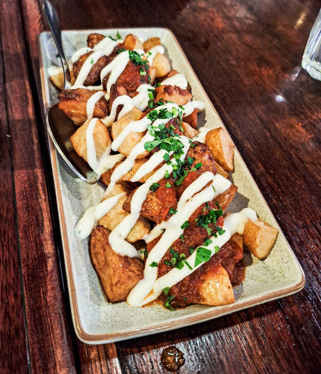 Patatas Bravas GF V: Crispy potatoes with a zesty tomato sauce.